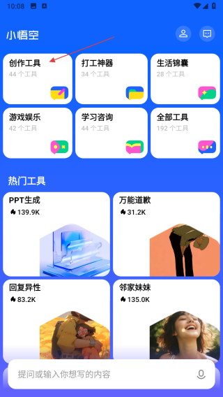 1、打開小悟空應(yīng)用,點擊首頁的創(chuàng)作工具板塊,進入包含多種智能工具的頁面。