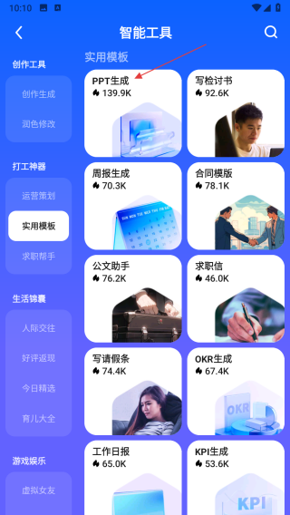 2、在創(chuàng)作工具的智能工具分類里,找到實用模板區(qū)域,選擇要使用的模板。