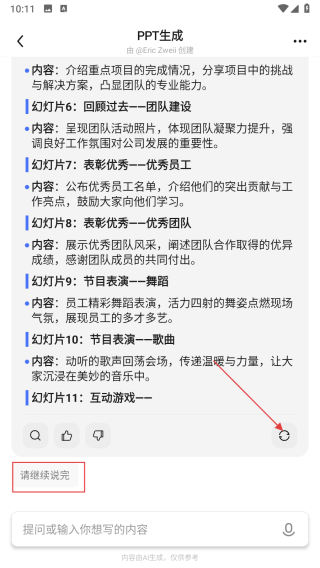 4、輸入內(nèi)容后,模板會生成相關(guān)內(nèi)容,需完善,可點擊下方請繼續(xù)說完,不滿意該回答就點擊右邊按鈕重新生成。