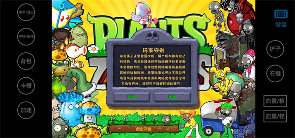2、在等待加載之后,我們就可以進(jìn)入到模擬器,就可以進(jìn)入到植物大戰(zhàn)僵尸雜交版的主界面,在主界面中點擊【同意】條款,然后點擊【開始】就可以進(jìn)入到游戲界面;