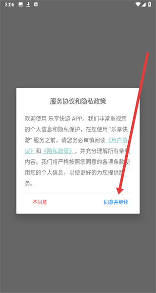1、在樂享快游APP的“服務(wù)協(xié)議和隱私政策”彈窗點擊“同意并繼續(xù)”,進入主界面。