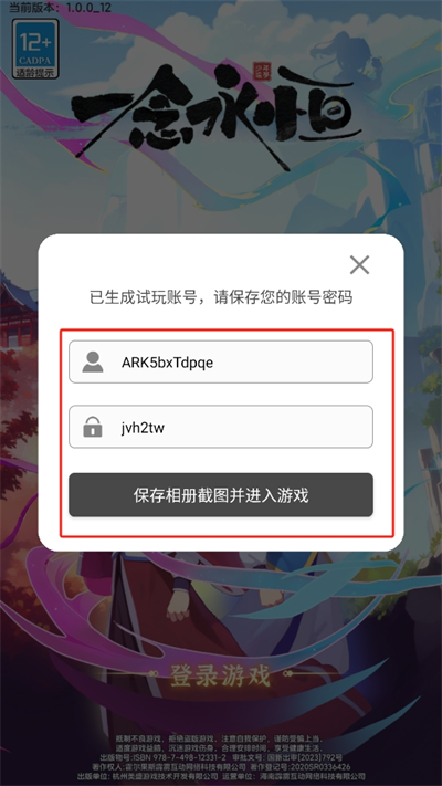 2、進(jìn)入游戲后由于是預(yù)下載玩法,所以會自動生成試玩賬號,通過保存相冊截圖并進(jìn)入游戲;
