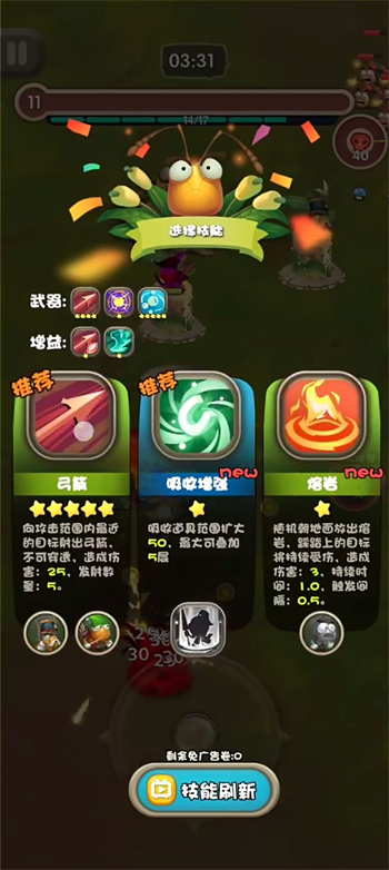 2、強(qiáng)敵實(shí)力逐漸增加的時(shí)候,需要不斷增強(qiáng)自己的戰(zhàn)斗技能,合理選擇不同戰(zhàn)斗實(shí)力的武器,如果沒有滿意的技能,還可以點(diǎn)擊下方的【技能刷新】帶來更多技能選擇;