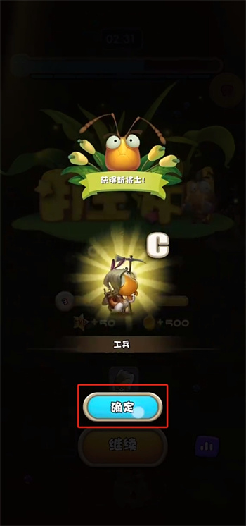 3、在戰(zhàn)斗勝利時(shí)候就可以收獲到獎(jiǎng)勵(lì),點(diǎn)擊下方的【確認(rèn)】領(lǐng)取新收獲的螞蟻士兵,幫助增加自己戰(zhàn)斗陣容的對抗力量;