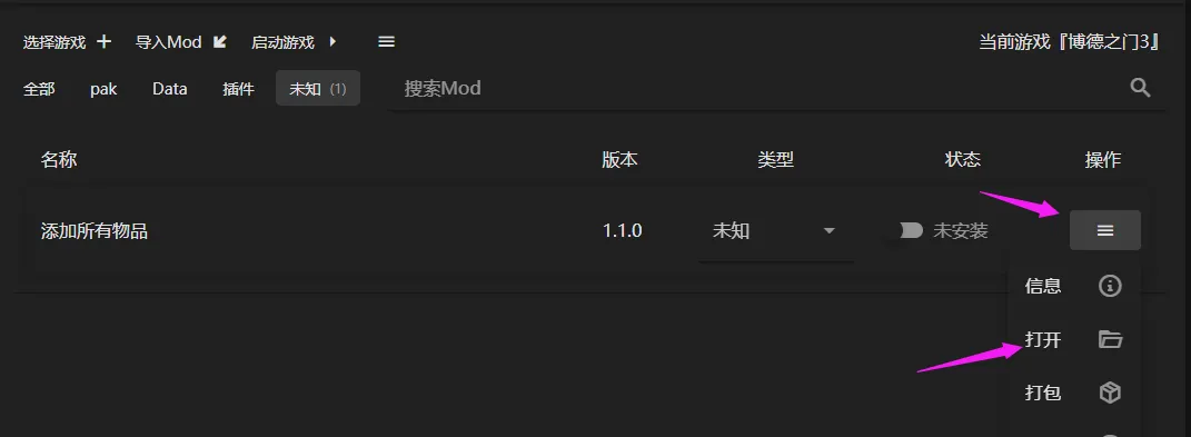 1、當(dāng)mod的類型在安裝時出現(xiàn)未知,可以找到mod列表下最右邊的操作下拉框中選擇打開找尋mod目錄;