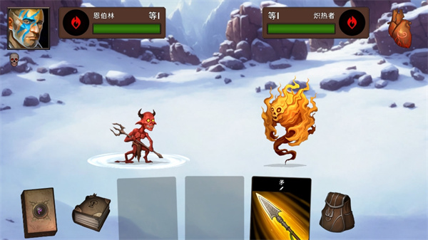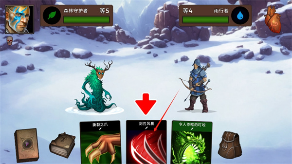 3、然后就可以操控自己的英雄進(jìn)入到雪山背景之下的戰(zhàn)場(chǎng)中,下方會(huì)隨機(jī)為你分配三個(gè)不同技能卡牌,選擇三個(gè)卡牌之中的一個(gè)技能對(duì)敵人進(jìn)行進(jìn)攻;