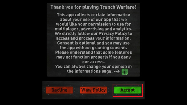 1、進入到游戲的場景內之后,玩家首先將需要進行一個用戶協(xié)議的同意,點擊屏幕右下角的綠色小按鈕即可;