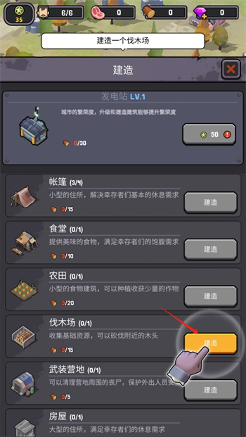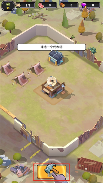 3、面對(duì)這個(gè)幸存基地的破舊環(huán)境,點(diǎn)擊下角的【建設(shè)】開(kāi)啟自己的建造任務(wù),砍伐周?chē)臉?shù)木對(duì)這個(gè)基地進(jìn)行更加豐富的建設(shè);