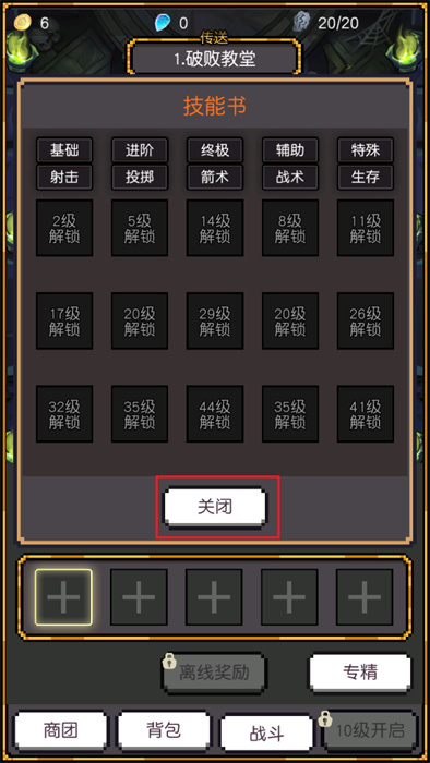 3、進(jìn)入到技能的選擇頁(yè)面后,可以看到自己可以選擇的技能,選擇好之后可以點(diǎn)擊【關(guān)閉】按鈕;
