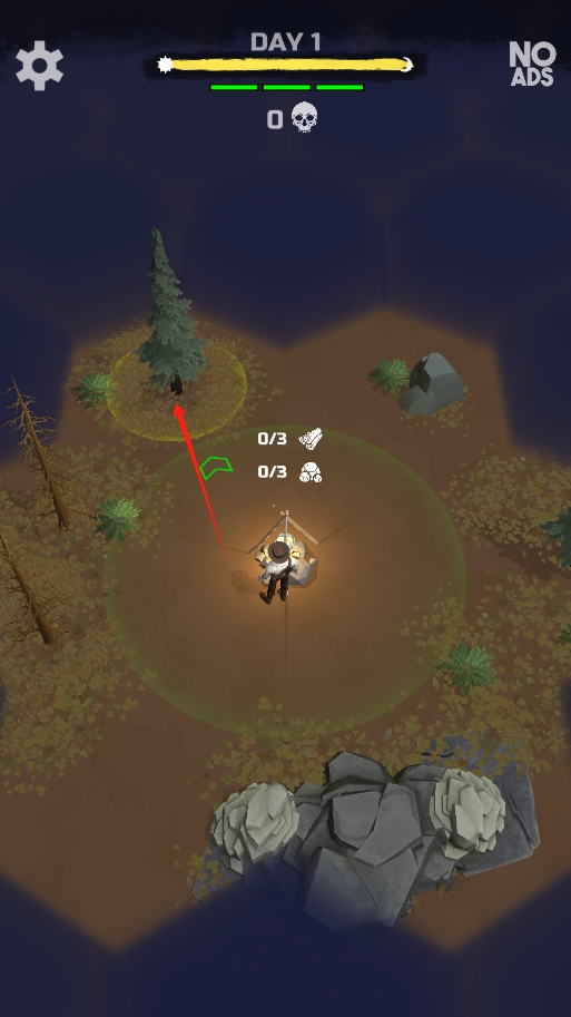1、我們可以看到需要的材料有木頭和石頭,滑動(dòng)屏幕就可以去往樹木那自動(dòng)砍樹;