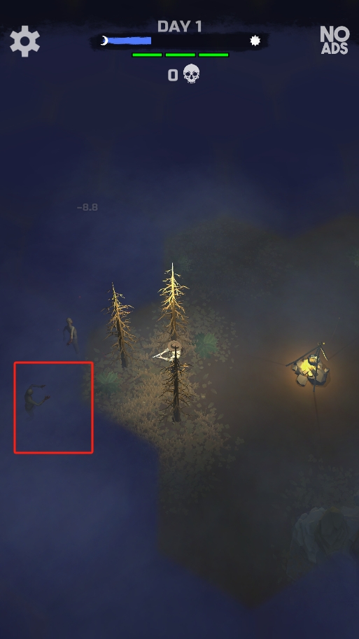 4、到夜晚的時(shí)候會(huì)出現(xiàn)一些僵尸,自動(dòng)攻擊他們輕松解決所有的敵人并生成到最后。