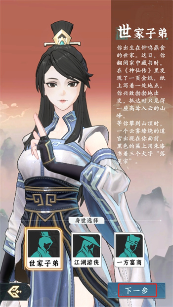 3、強(qiáng)大門派中的一員、孤身一人闖蕩江湖的獨(dú)客、世家有錢的富家子弟,每一個(gè)選擇都會(huì)帶來(lái)別樣的未來(lái)故事發(fā)展,在選擇完身世之后點(diǎn)擊【下一步】;