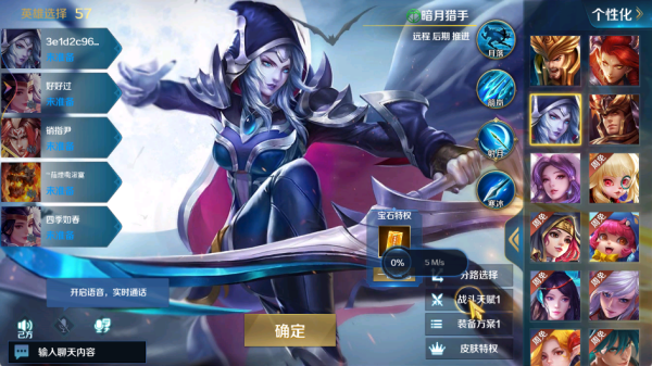 6、在英雄選擇界面可以選擇自己想要體驗(yàn)的英雄,可以選擇戰(zhàn)斗天賦、分路等,確認(rèn)完畢后點(diǎn)擊【確定】按鈕即可;