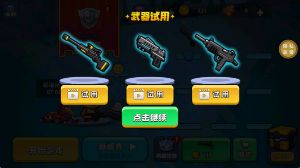 4、玩家還可以通過觀看廣告的方式獲得試用武器,這些試用武器的威力都是十分強大的,不需要的話也可以點擊繼續(xù)選項進入游戲;