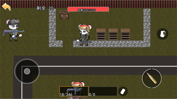 6、進入地圖后,有紅色血條的就是你的目標了,左側(cè)輪盤移動,右側(cè)輪盤射擊,還能切換武器、使用治療品、打開背包等。