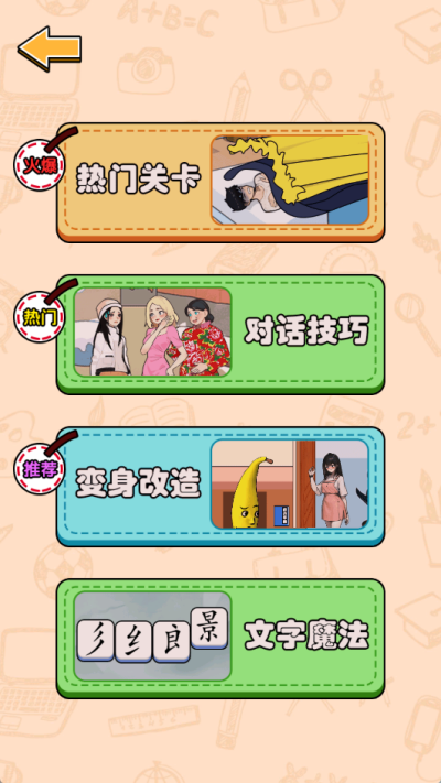 2、點擊后進入關(guān)卡選擇界面,在這里為大家提供熱門關(guān)卡、對話技巧、變身改造和文字魔法等多個關(guān)卡類型,自由選擇進入;