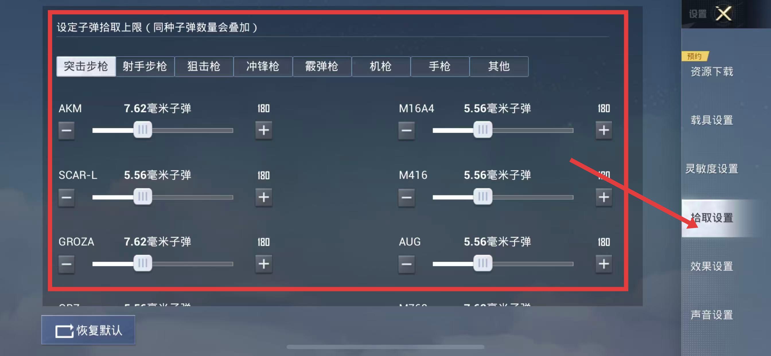 3、找到并點擊拾取設置選項,設置拾取的子彈數(shù)量。