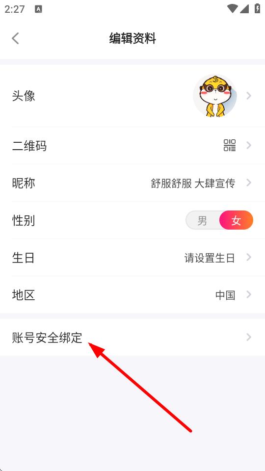 3、在編輯資料頁(yè)面里,找到并點(diǎn)擊賬號(hào)安全綁定選項(xiàng)。