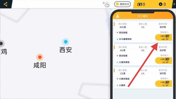 2、打工模式下優(yōu)先挑短途任務(wù)如西安區(qū)域訂單,避免初期接長距離任務(wù)浪費時間,查看任務(wù)距離、收益及乘客需求后確定接單,把控資源積累效率。