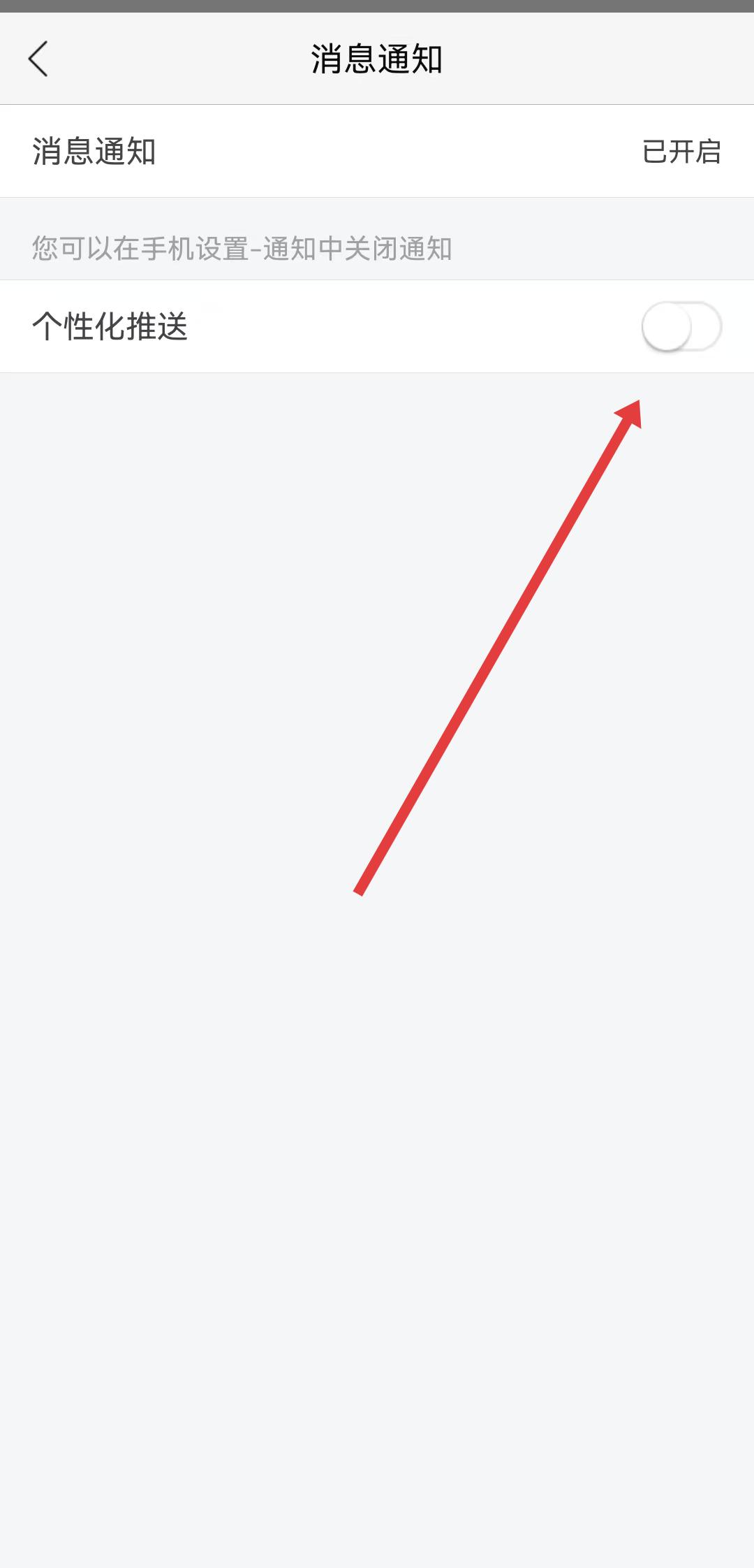 3、在消息通知頁面中,找到個(gè)性化推送選項(xiàng),點(diǎn)擊其右側(cè)的開關(guān)圖標(biāo),使開關(guān)從開啟狀態(tài)變?yōu)殛P(guān)閉狀態(tài)。