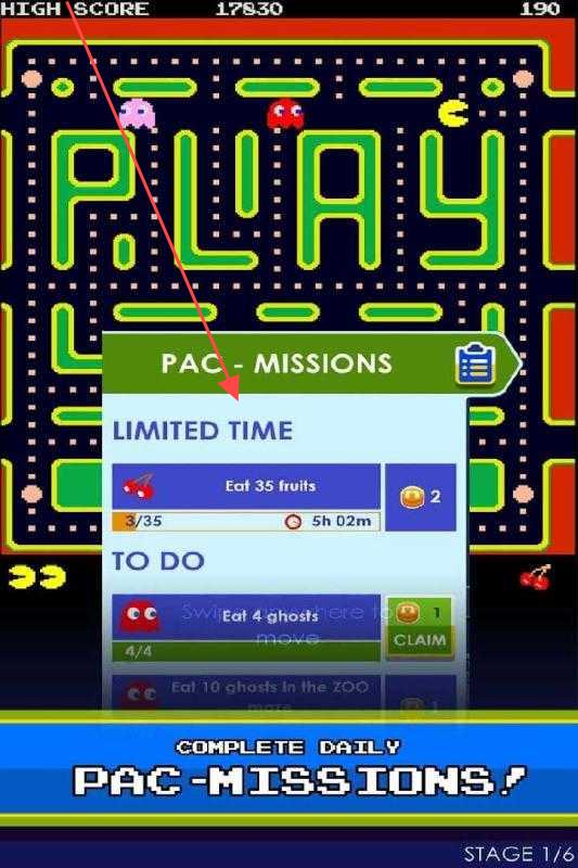 2、游戲過(guò)程中,留意【PAC-MISSIONS】任務(wù)欄,像【LIMITED TIME】下的“Eat35fruits”任務(wù),在限時(shí)內(nèi)完成可獲取獎(jiǎng)勵(lì)。