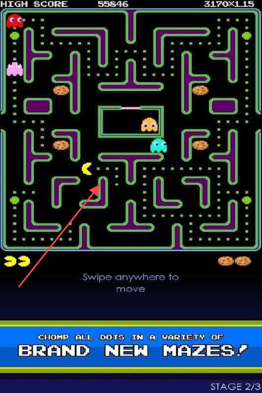 3、操控吃豆人時(shí),按照提示“Swipe anywhere to move”,在屏幕任意位置滑動(dòng)來(lái)移動(dòng)吃豆人,吃掉迷宮中的圓點(diǎn)和道具,躲避幽靈。