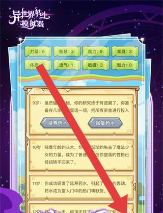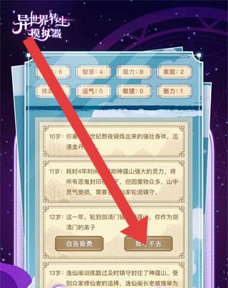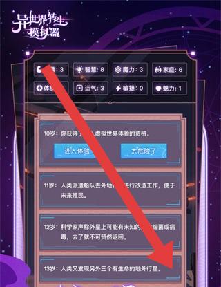 1、進(jìn)入游戲界面后,面對【異世界轉(zhuǎn)生模擬器】的年齡事件(如第一張圖13歲選項(xiàng)),點(diǎn)擊箭頭指向的選擇按鈕。
