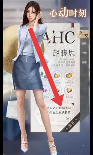 3、緊跟好感度等級(jí)的箭頭指引(第三張圖趙曉思界面“10級(jí)解鎖套裝”),通過(guò)【前往】觸發(fā)深度互動(dòng)。