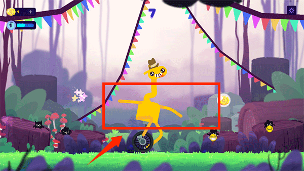 1、玩家開始游戲后,首先要操控長頸鹿騎上獨(dú)輪車,保持平衡前行,開啟冒險(xiǎn)旅程,注意不能摔倒,否則需重新開始。