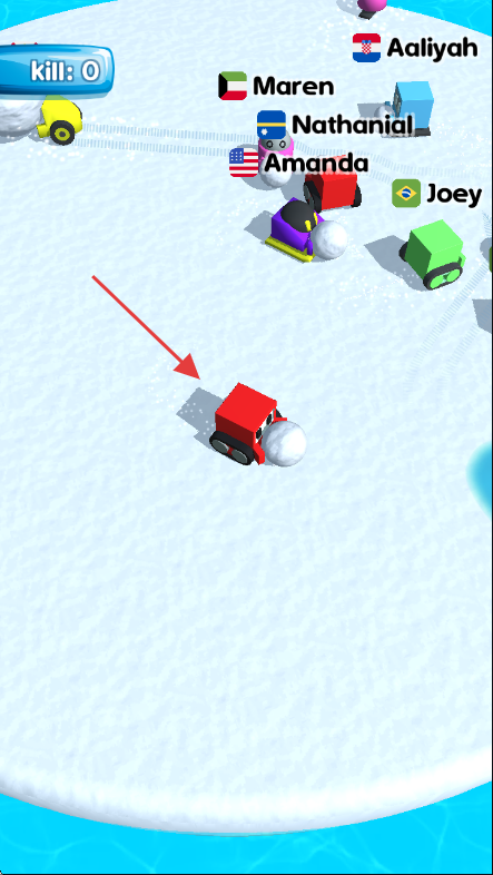 3、游戲中操控紅色小車,在雪地場景中與其他玩家互動,通過收集雪球或參與戰(zhàn)斗提升【kill】計數(shù),體驗雪地對戰(zhàn)樂趣。
