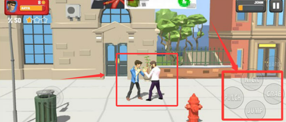 2、當(dāng)敵人出現(xiàn)時(shí),可以點(diǎn)擊右側(cè)的PUCH、KICK、JUMP、GRAB按鈕來(lái)攻擊和躲避敵人。