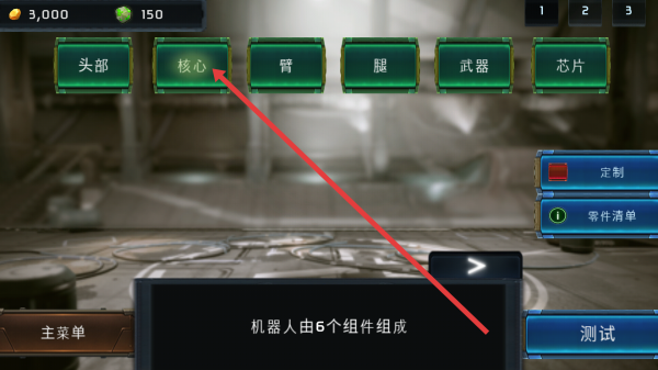 3、進(jìn)入組件定制界面,選擇【核心】等組件(頭部、核心、臂、腿、武器、芯片),定制機(jī)器人,提升其性能。