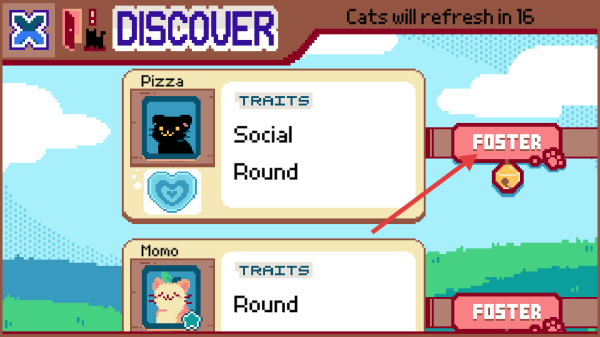 2、在【DISCOUER】界面,查看貓咪(如Pizza)的特質(zhì)(Social、Round),點(diǎn)擊【FOSTER】按鈕收養(yǎng)貓咪。