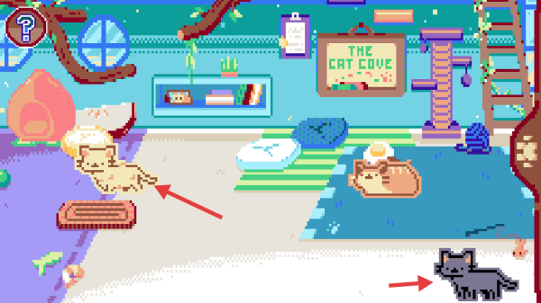 1、在貓咪互動(dòng)場(chǎng)景中,觀察并點(diǎn)擊感興趣的貓咪(如淺色貓咪、黑色貓咪)。