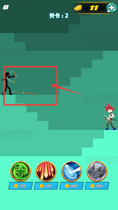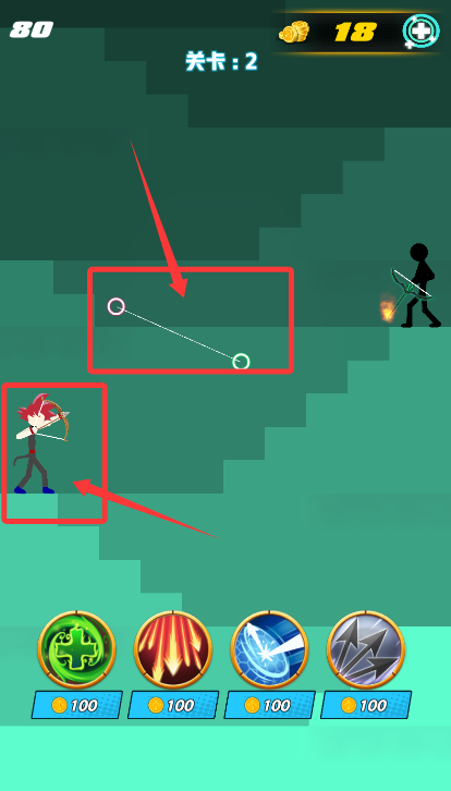 3、長(zhǎng)按屏幕蓄力拉弓,松開手指發(fā)射箭矢,通過調(diào)整角度精準(zhǔn)打擊敵方目標(biāo)。