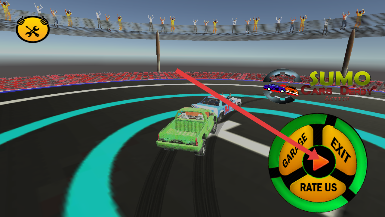 1、在游戲主界面,點(diǎn)擊右下角綠色圓形按鈕(箭頭指向),進(jìn)入游戲場(chǎng)景,開始賽車對(duì)戰(zhàn)。