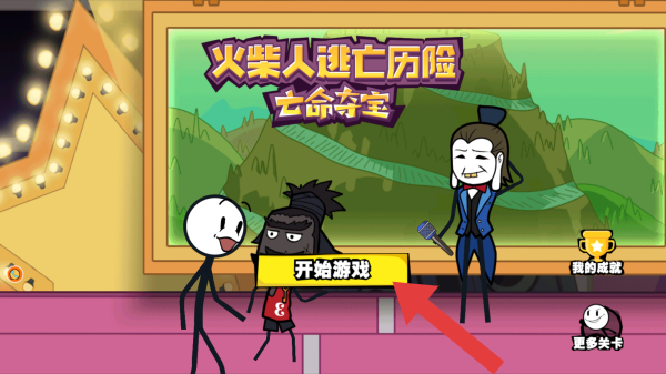 1、玩家將操控火柴人在亡命奪寶的情境下展開逃亡冒險,需應(yīng)對各種阻礙、解開謎題來完成奪寶并成功逃亡,界面中【開始游戲】按鈕用于進(jìn)入。
