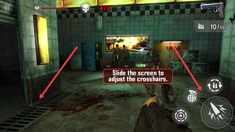 1、跟隨引導(dǎo)操作,左手搖桿讓角色扭出魔鬼步伐,右手點擊屏幕給僵尸做開顱手術(shù)。