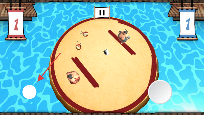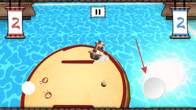 3、點(diǎn)擊右側(cè)按鈕攻擊,將對(duì)手推落圓形場(chǎng)地,達(dá)成勝利。