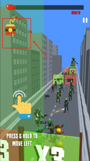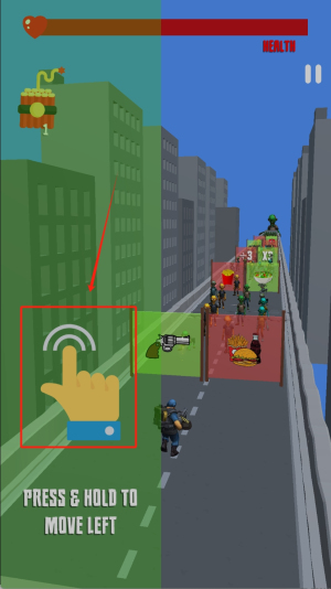 2、游戲過程中按住左側(cè)PRESS & HOLD TO MOVE LEFT區(qū)域控制角色移動,注意上方HEALTH血量條確保生存。