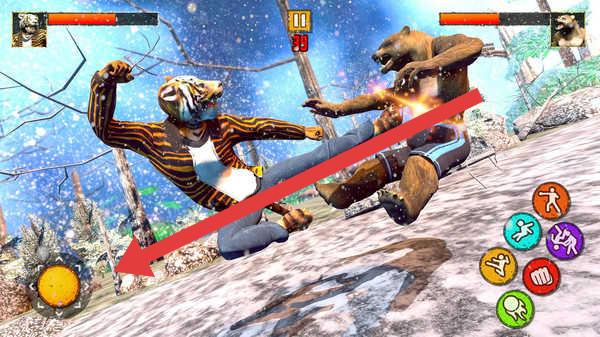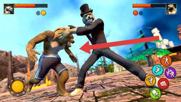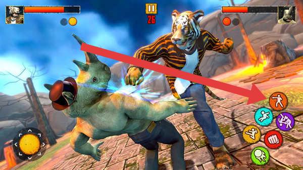 3、操控不同動(dòng)物角色(犀牛、人形動(dòng)物),針對(duì)敵方弱點(diǎn)(如箭頭指向的攻擊判定),組合技能,擊敗對(duì)手。
