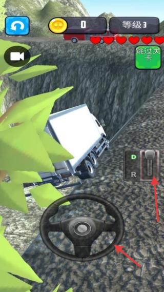 3、駕駛關(guān)卡中,操控方向盤、換擋按鈕(如右側(cè)D/R鍵),控制卡車在山路行駛,完成運輸任務(wù)。