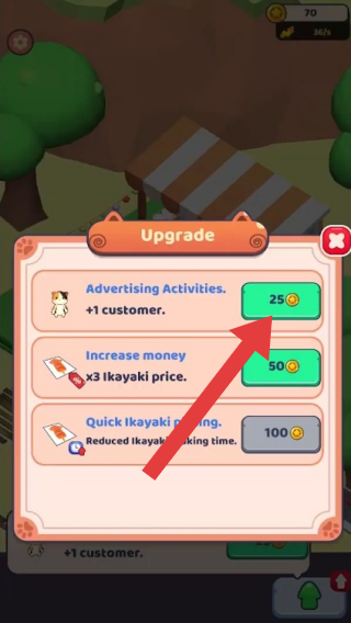 1、呈現(xiàn)了AdvertisingActivities、Increasemoney(提升收益,花費50金幣可使章魚燒價格×3)QuickIkayakimaking三種升級選項,用于玩家提升店鋪經(jīng)營能力。
