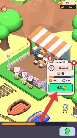 2、呈現(xiàn)的是章魚燒攤位(Ikayaki)的升級界面,當(dāng)前為13級,顯示制作時間2.5秒、收益146,花費42金幣可進(jìn)行升級,用于玩家提升攤位經(jīng)營能力。