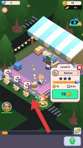 3、呈現(xiàn)拉面攤位(Ramen)經(jīng)營場景,當(dāng)前攤位等級9級,制作時間3.0秒、收益16,花費19金幣可升級,用于玩家提升拉面攤位經(jīng)營能力,推動壽司店整體發(fā)展。