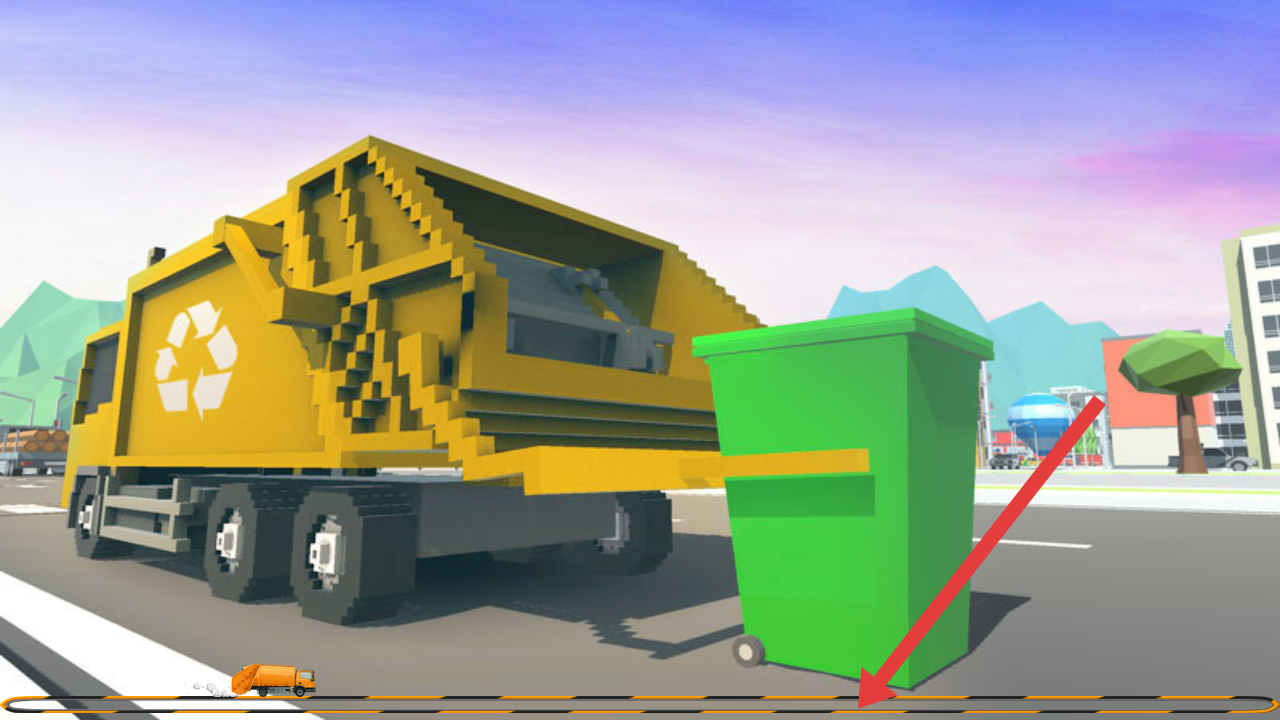 2、在游戲中需要駕駛自己的黃色垃圾車,靠近綠色垃圾桶,等待進(jìn)度條加載完成以收集垃圾。
