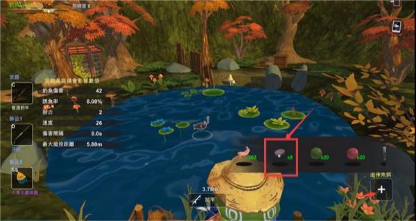 1、下載安裝完成之后進(jìn)入游戲,首先我們需要來到一個(gè)魚塘旁,選擇魚餌以及誘餌。