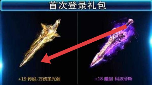 1、在首次登錄禮包界面,選擇箭頭指向的“+19傳說(shuō)-萬(wàn)仞圣光劍”,領(lǐng)取強(qiáng)力武器,提升角色戰(zhàn)力。