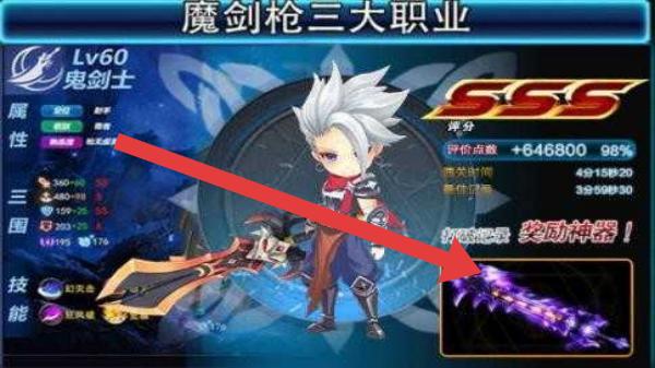 2、魔劍槍職業(yè)頁(yè),關(guān)注箭頭標(biāo)記的“魔劍-阿波菲斯”獎(jiǎng)勵(lì),完成鬼劍士評(píng)分任務(wù)(如646800分),獲取神器。