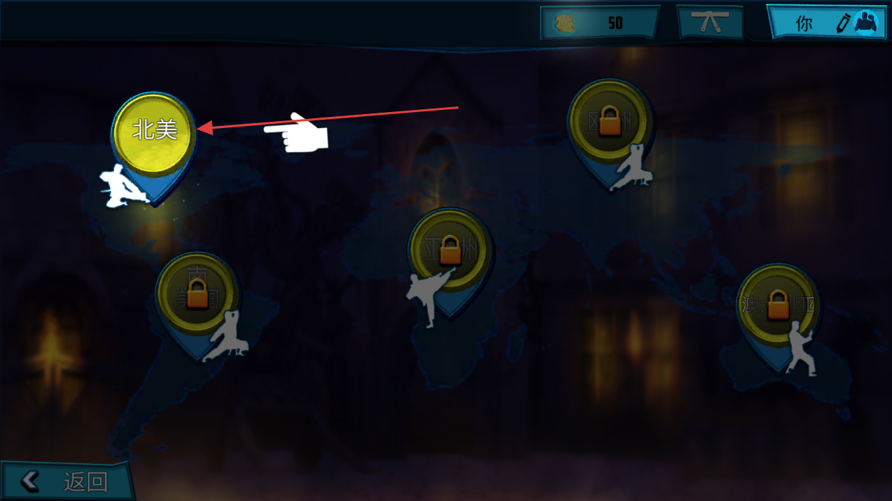 1、在地圖界面,點擊解鎖的區(qū)域(如“北美”),進入對應格斗場景,挑戰(zhàn)對手。
